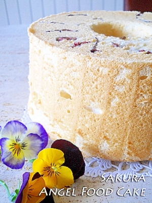 シフォンケーキを極める part 1 シフォンケーキの基準点となるエンゼルフードケーキを一般公開されているBoston Cooking Schoolの標準レシピに忠実に作成、high ratio cakeの神髄に迫ってみました。 このレシピを試すのにかかる時間約35分(ケーキを冷ます時間とデコレーションの時間を除く)エンゼルフードケーキの作り方材料(18cmアルミのエンゼル型1台)・卵白 30g・グラニュー糖 30g・塩 少々・薄力粉 50g・ベーキングパウダー 小匙1/2・レモン汁 小匙1/2 卵白 60g グラニュー糖 40g作り方 作り方 1 桜の花の塩漬けを水につけて、塩気をとり、水気をきり、型に並べておく。 (もちろんなくてもOK) オーブンも180度にセット♪ 2 オイルと牛乳を混ぜる。 (牛乳じゃなくても好みの水分でもOK♪) 3 ふるった小麦粉投入! 4 バニラオイルも入れて混ぜる。 5 砂糖を2、3回に分けて卵白を泡立てる。